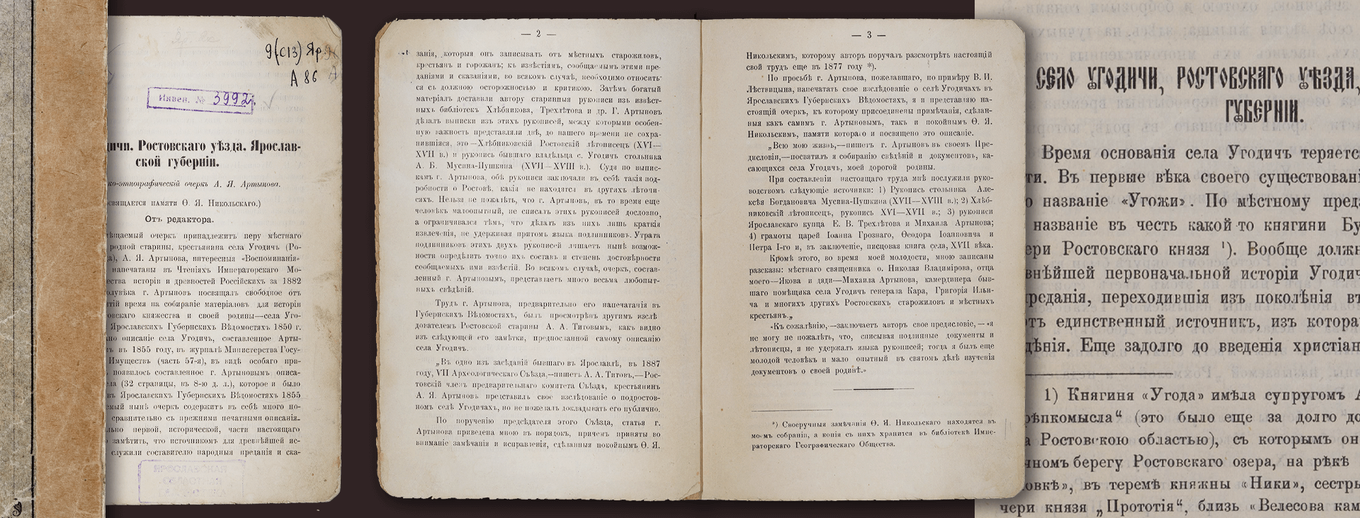 Первое отдельное издание историко-этнографического очерка об Угодичах — крупном селе в Ростовском уезде Ярославской губернии, расположенном на восточном берегу озера Неро напротив Ростова Великого — было написано жителем села Александром Яковлевичем Артыновым. Значительная часть этого труда посвящена истории села с древнейших времен, которая в изложении автора изобилует легендарными персонажами и полна драматических событий. Уже в XIX веке эта часть воспринималась историками и краеведами достаточно критически. Вторая часть книги содержит интересные географические и этнографические подробности о селе, его храмах, занятиях жителей, праздниках и обрядах, поверьях, суевериях и предрассудках.