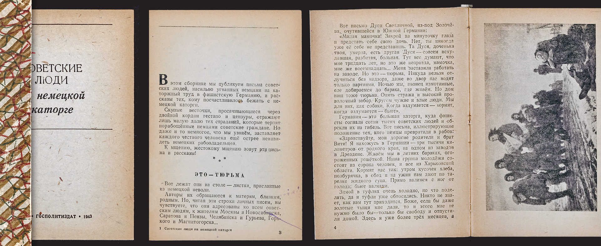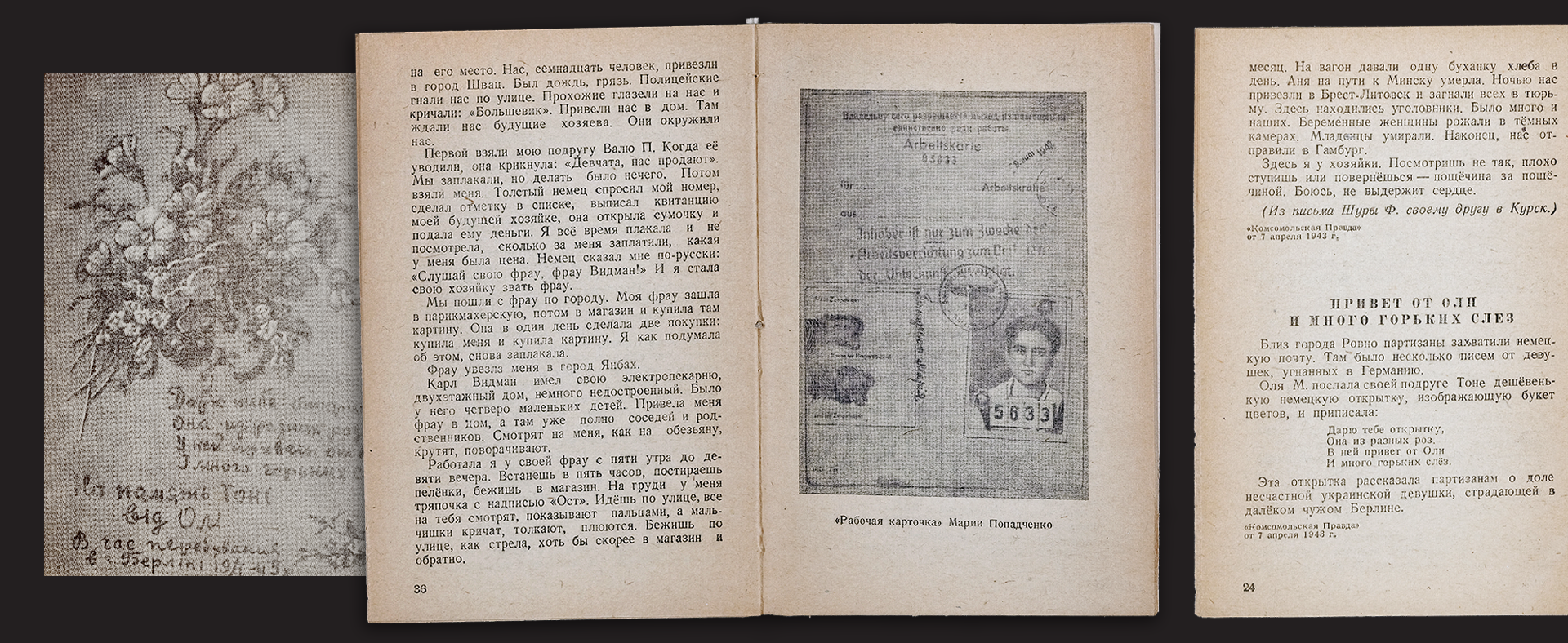 Пройдя кордоны немецкой военной цензуры, письма, записки, открытки добирались до оставшихся на временно оккупированных врагом территориях родственников и знакомых, и после освобождения этих районов нашими войсками становились достоянием. Эти письма, как и воспоминания сумевших сбежать из нацистских «рабочих лагерей», свидетельствуют о бесчеловечном отношении в «царстве рабства — Германии» к угнанным на работы советским юношам и девушкам.