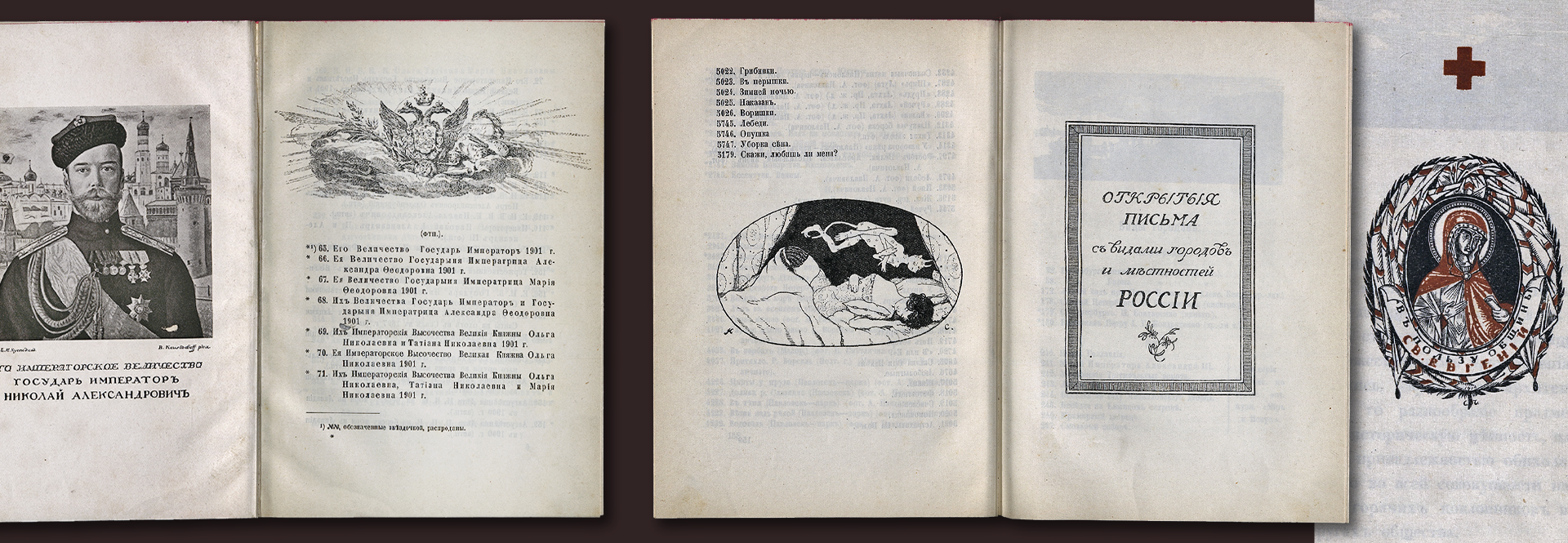 Первый раздел книги посвящён каталогам наиболее значимых серий открытых писем: портретам членов царствующего дома Романовых; историческим портретам героев Отечественной войны 1812 года; каталогам экспонатов ведущих российских и иностранных музеев: императорского Эрмитажа, Третьяковской галереи, Румянцевского музея, Дрезденской галереи.