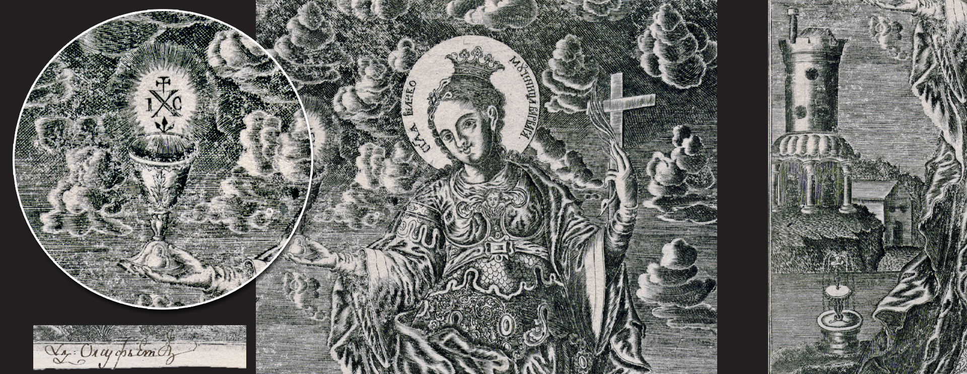 Образ святой Варвары Илиопольской получил широкое распространение на Руси в XVII века. Её изображение в рост, с пальмовой ветвью (символом мученичества), крестом и Чашей Святых Даров в руках, на фоне башни, в которой святая была заточена своим отцом — иконографически сложившийся тип, — встречается на многих европейских гравюрах XVI–XVII веков (Г. Бальдунга, Л. Кранаха, И. Мекенена, В. Холлара и др.) и поздних лубочных иконах.