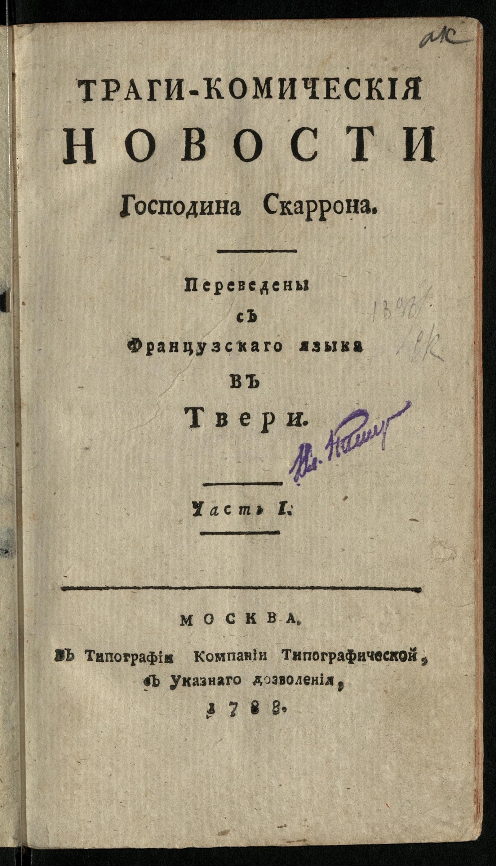 ИздательствоТраги-комическия новости господина Скаррона: Переведены с французскаго языка в Твери. Ч. 1