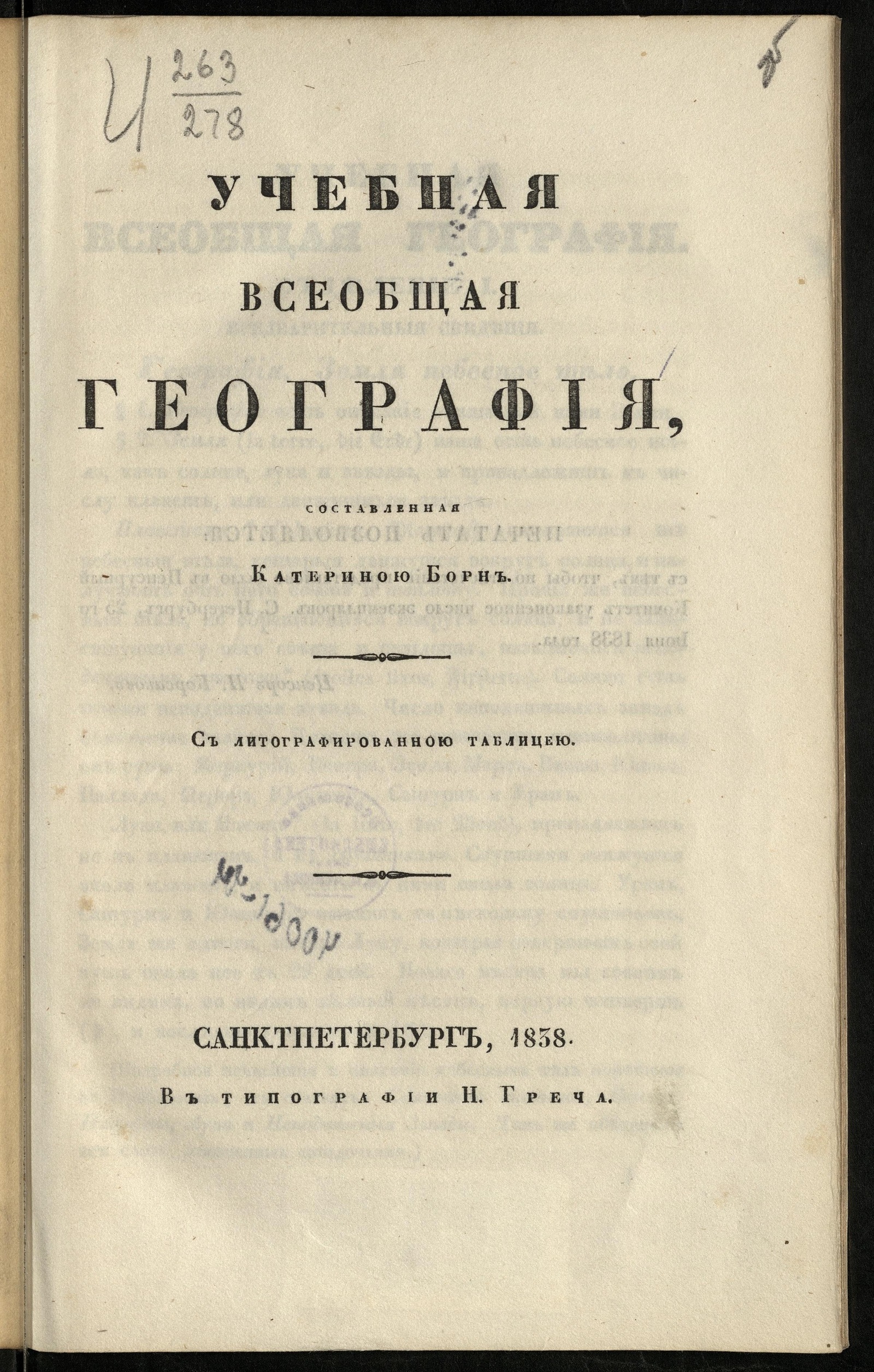 ИздательствоУчебная всеобщая география, / составленная Катериной Борн: с литографированною таблицею