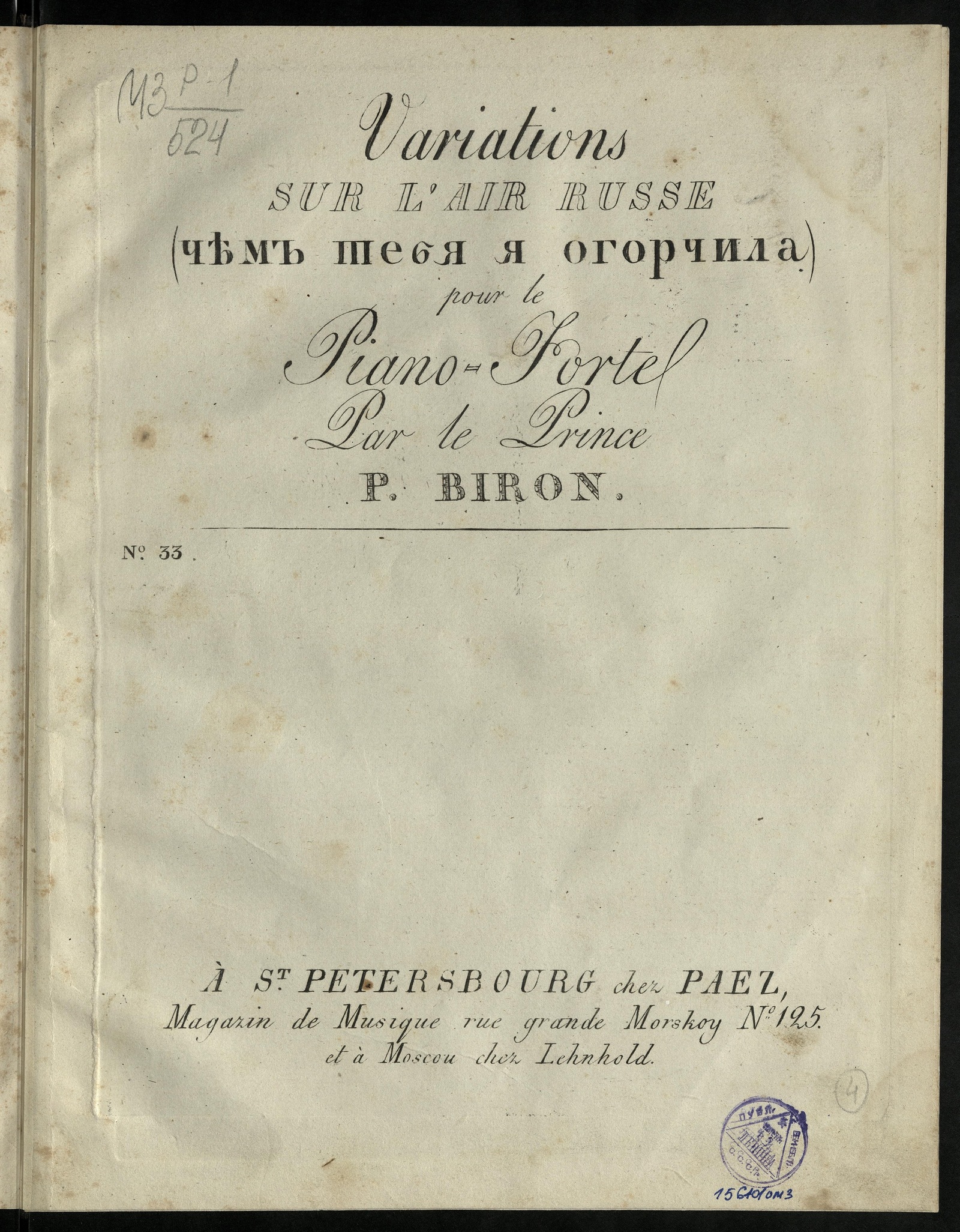 ИздательствоVariations sur l’air russe (Чем тебя я огорчила): pour le piano-forte / par le Prince P. Biron