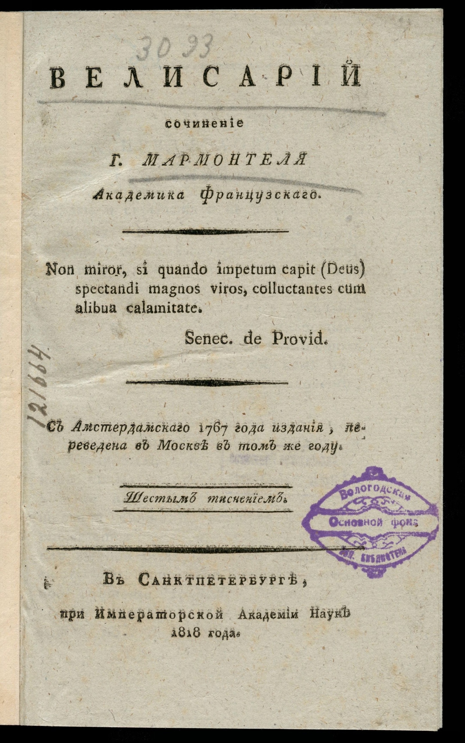 ИздательствоВелисарий / Сочинение г. Мармонтеля, академика французскаго.; С амстердамскаго 1767 года издания, переведена в Москве в том же году