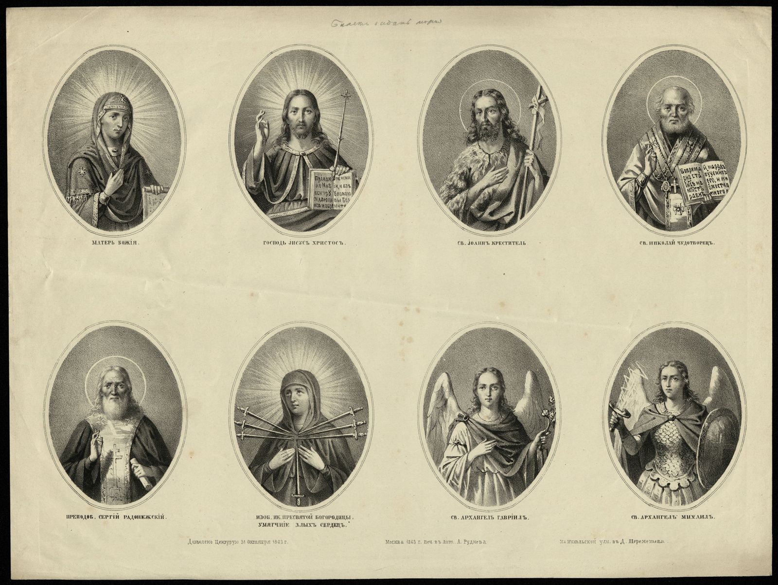 Издательство[Восьмичастное изображение икон Пресвятой Богородицы, Господа Иисуса Христа, архангелов Гавриила и Михаила, святых Иоанна Крестителя, Николая Чудотворца, Сергия Радонежского]: [лубок]