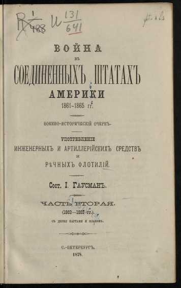 ИздательствоВойна в Соединенных штатах Америки 1861–1865 гг. : Воен.-ист. очерк: Употребление инж. и арт. средств и реч. флотилий / Сост. И. Гаусман. Ч. 2. 1862–1863 гг