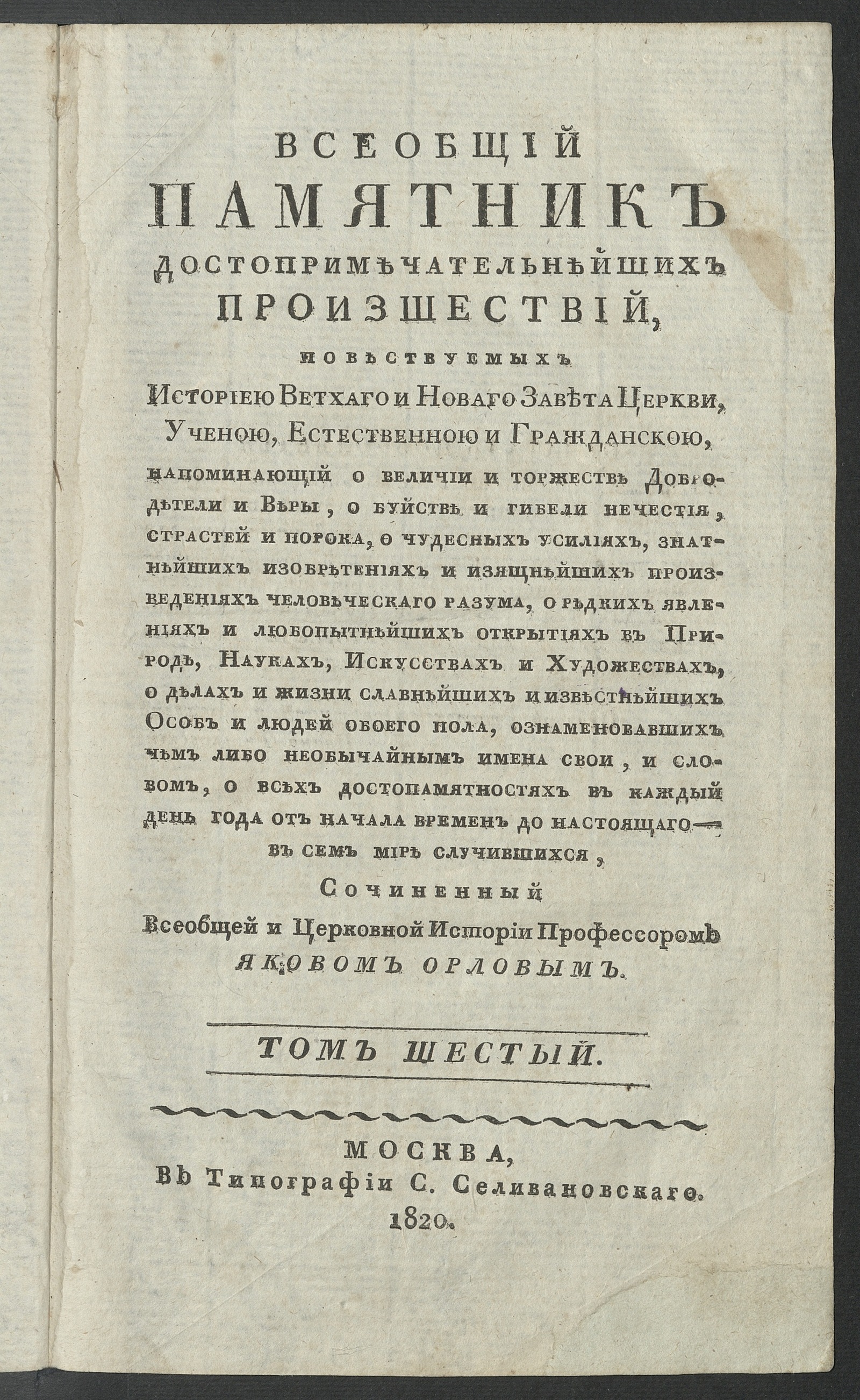 ИздательствоВсеобщий памятник достопримечательнейших произшествий: Повествуемых историею Ветхаго и Новаго Завета церкви, ученою, естественною и гражданскою, напоминающий о величии и торжестве добродетели и веры, о буйстве и гибели нечестия, страстей и порока, о чудесных усилиях, знатнейших изобретениях и изящнейших произведениях человеческаго разума, о редких явлениях и любопытнейших открытиях в природе, науках, искусствах и художествах, о делах и жизни славнейших и известнейших особ и людей обоего пола, ознаменовавших чем-либо необычайным имена свои, и словом, о всех достопамятностях в каждый день года от начала времен до настоящаго — в сем мире случившихся, / Сочиненный Всеобщей и Церковной Истории Профессором Яковом Орловым. Том 3. [Месяц март]