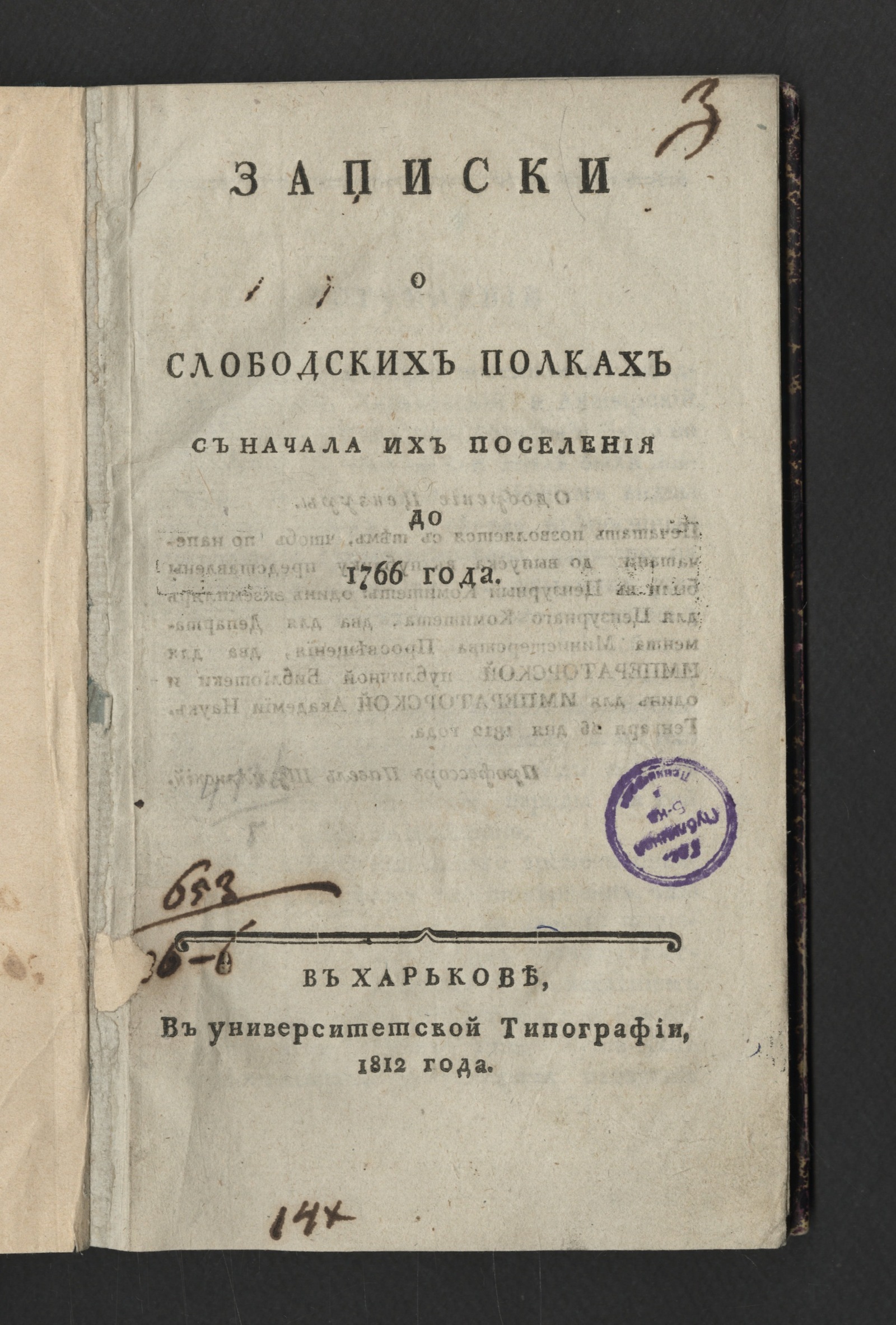 ИздательствоЗаписки о слободских полках с начала их поселения до 1766 года