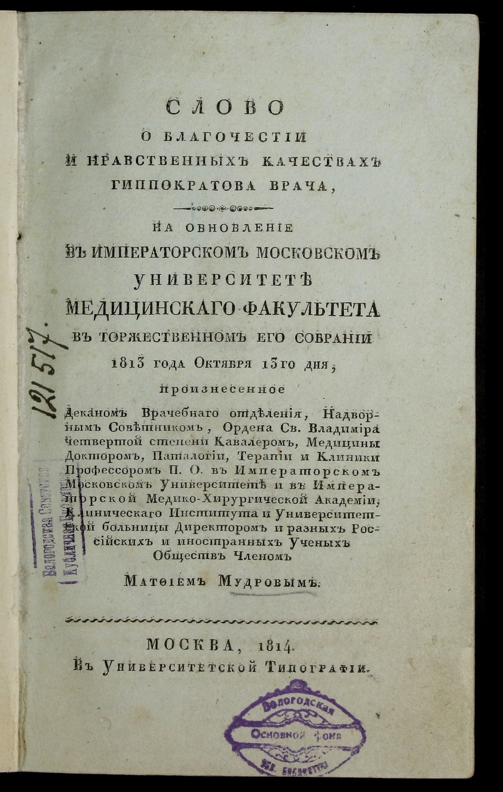 Описание торжественнаго обновления и освящения медицинскаго факультета в Императорском Московском университетеМудров, Матвей Яковлевич Москва 1814