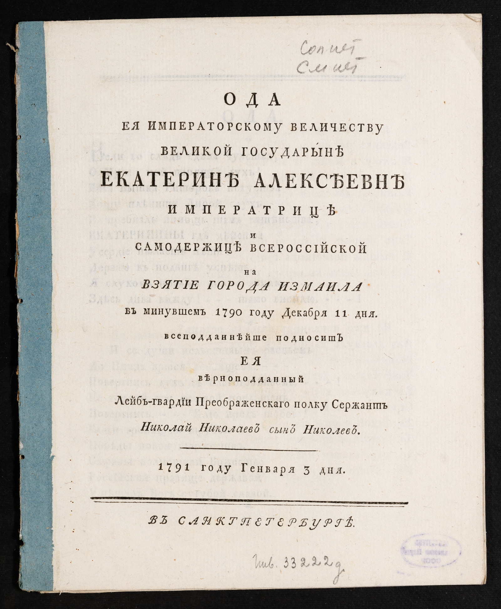 Ода Ея Императорскому Величеству ... Екатерине Алексеевне ... на взятие города Измаила в минувшем 1790 году декабря 11 дняНиколев, Николай НиколаевичВ Санктпетербурге1791